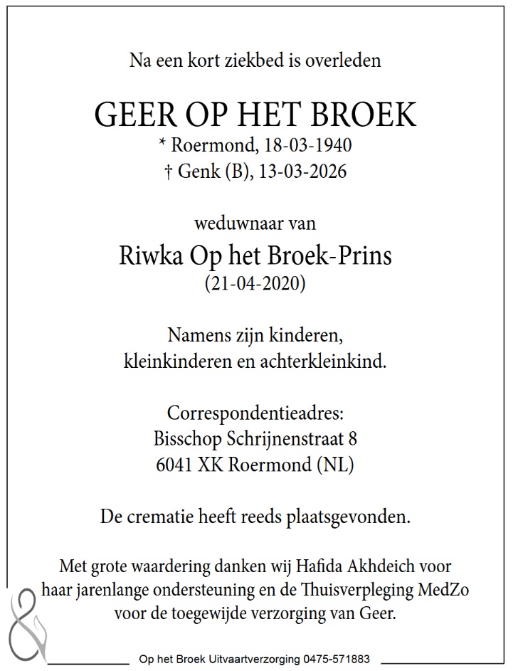 Op 13 maart is Geer Op het Broek na een kort ziekbed overleden. Dit was 5 dagen voor zijn 86e verjaardag. De crematie heeft inmiddels in besloten kring plaatsgevonden.